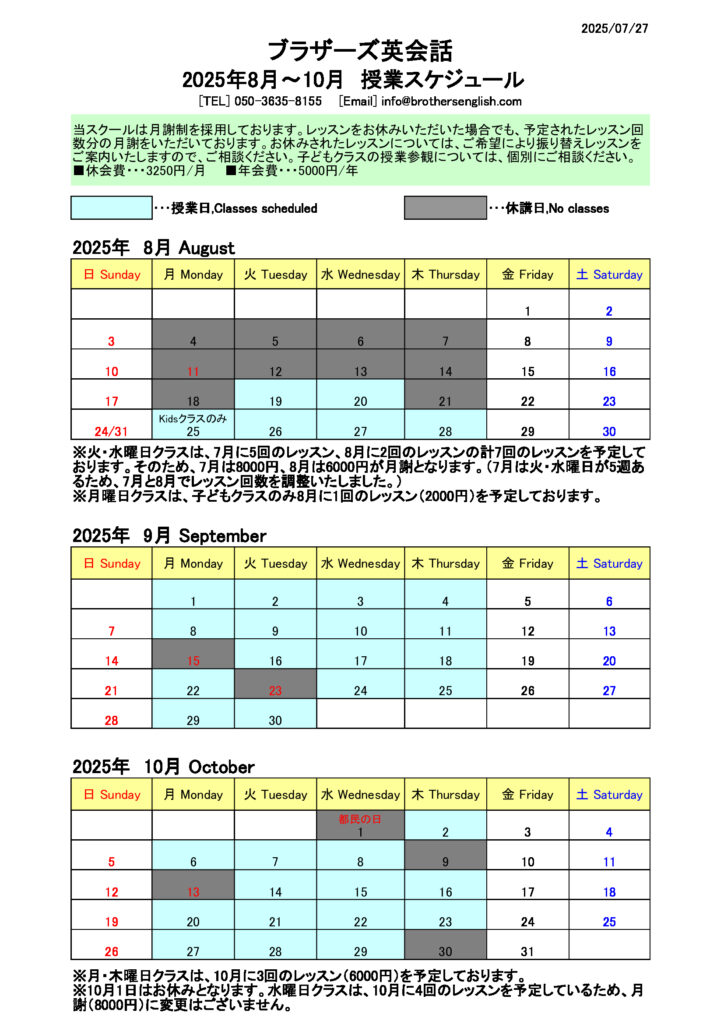 2025年8月~10月の授業日をお知らせします。