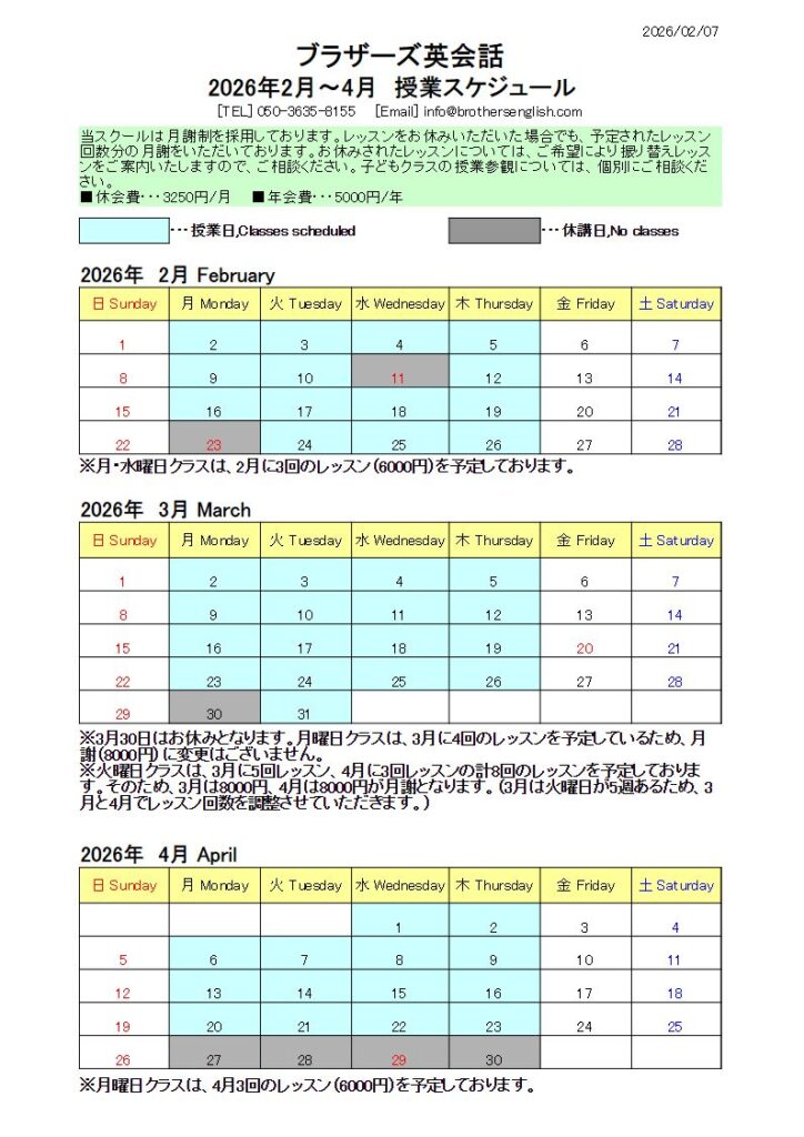 2026年2月~4月の授業日をお知らせします。